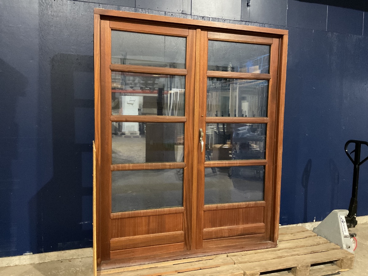 Brugt Dobbelt Mahogni Terrassedør, træ/træ, 2 lag glas, hængt på begge sider, hårdttræsbundstykke, udadgående, mål: H211,6 B176,8 D11,5 Varenummer: 1671 Højrehængt, Venstrehængt, Udadgående, Dobbelt, 2 lags glas, Hårdt træ, Træ/Træ, Andet