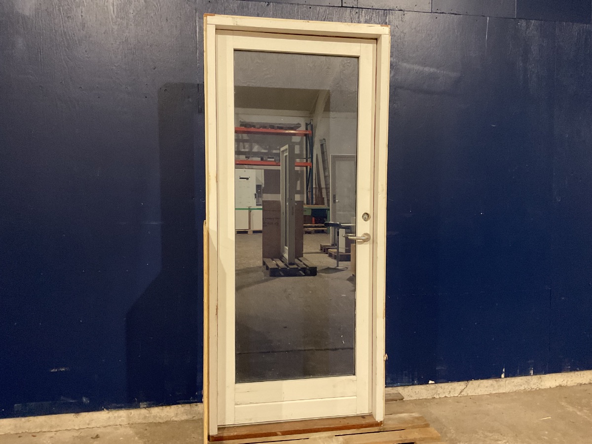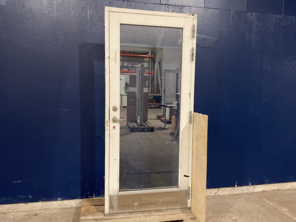 Brugt Yderdør, træ/træ, 2 lag glas, højrehængt, udadgående, hårdttræsbundstykke, nøgle medfølger ikke, lås på indersiden mangler, døren har skader forskellige steder både på ydersiden og indersiden, mål: H212 B94,5 D11,7 Varenummer: 1674 Højrehængt, Udadgående, Enkelt, 2 lags glas, Hårdt træ, Træ/Træ, Andet