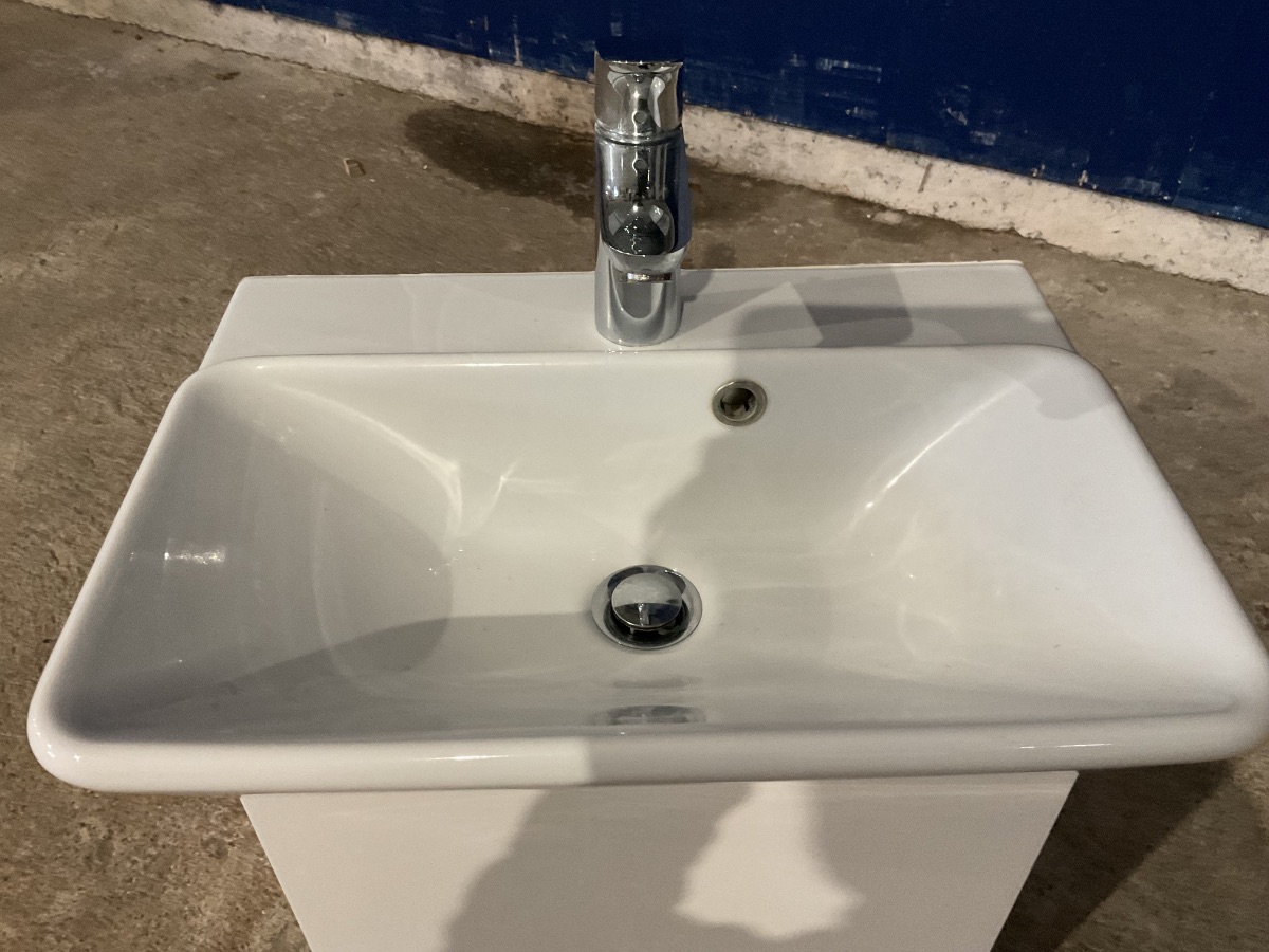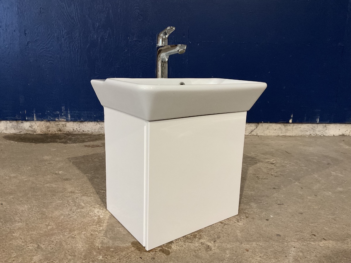 Brugt Badeværelsesmøbel med vask og armatur, armaturet er et Hansgrohe, mål: H50,3 B49,5 D36 Varenummer: 1689