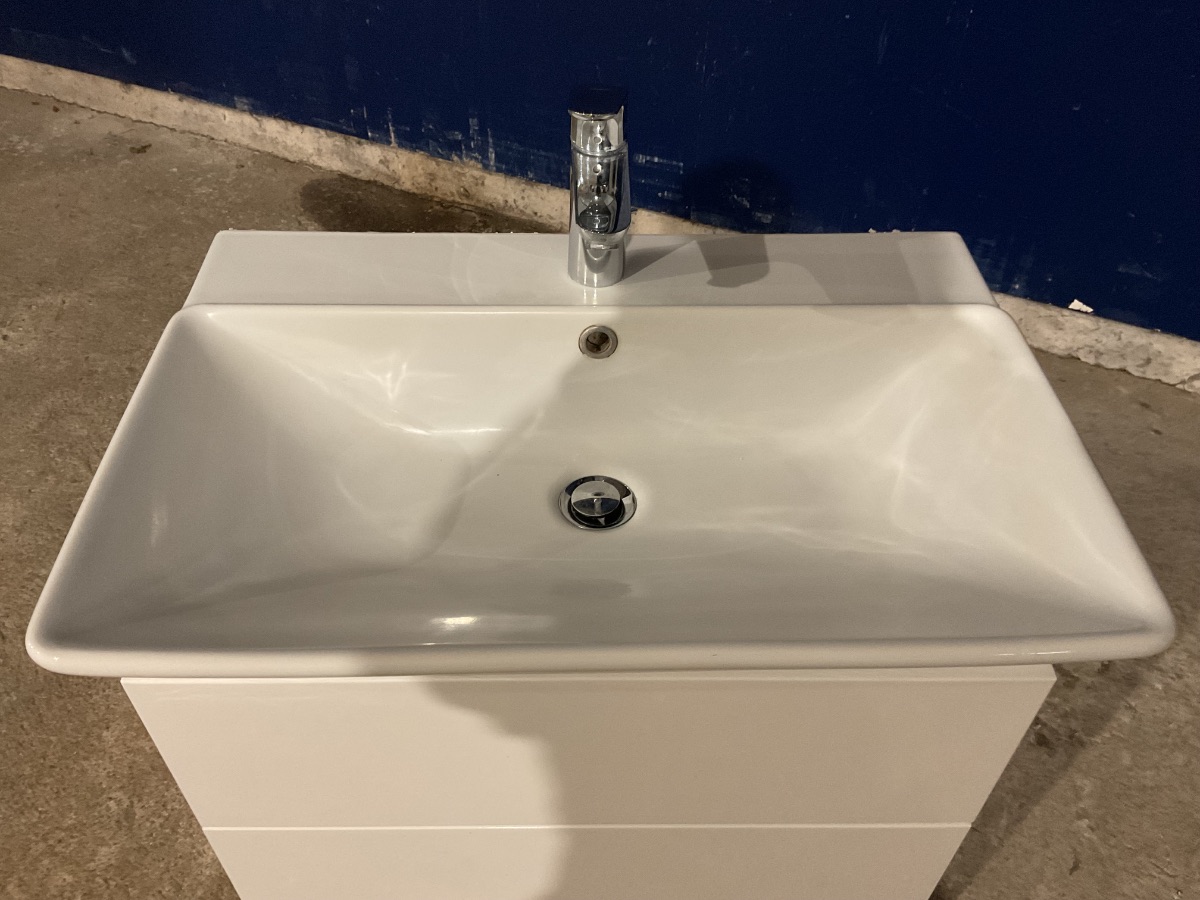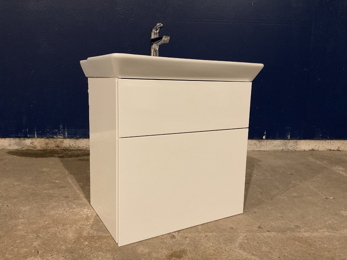 Brugt Badeværelsesmøbel med vask og armatur, armaturet er et Hansgrohe, mål: H67,8 B67,8 D46 Varenummer: 1690