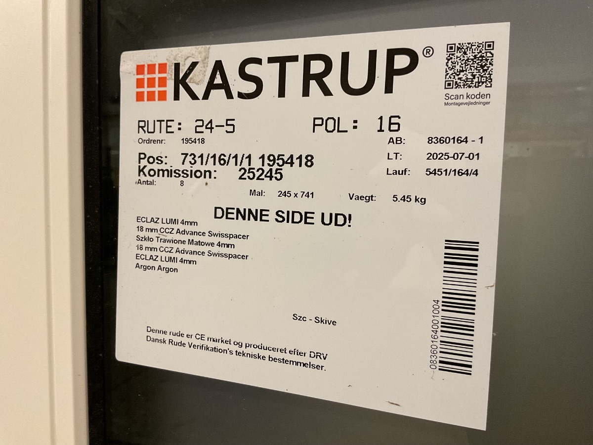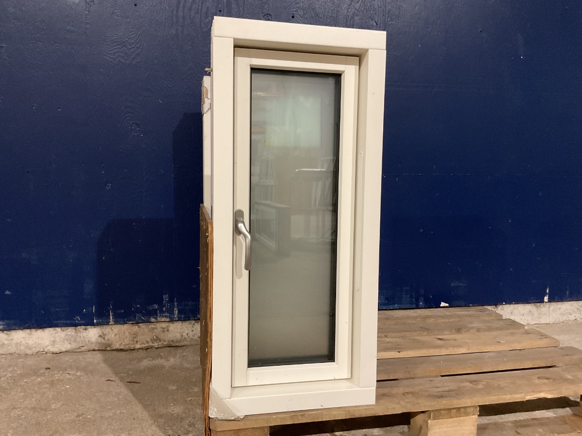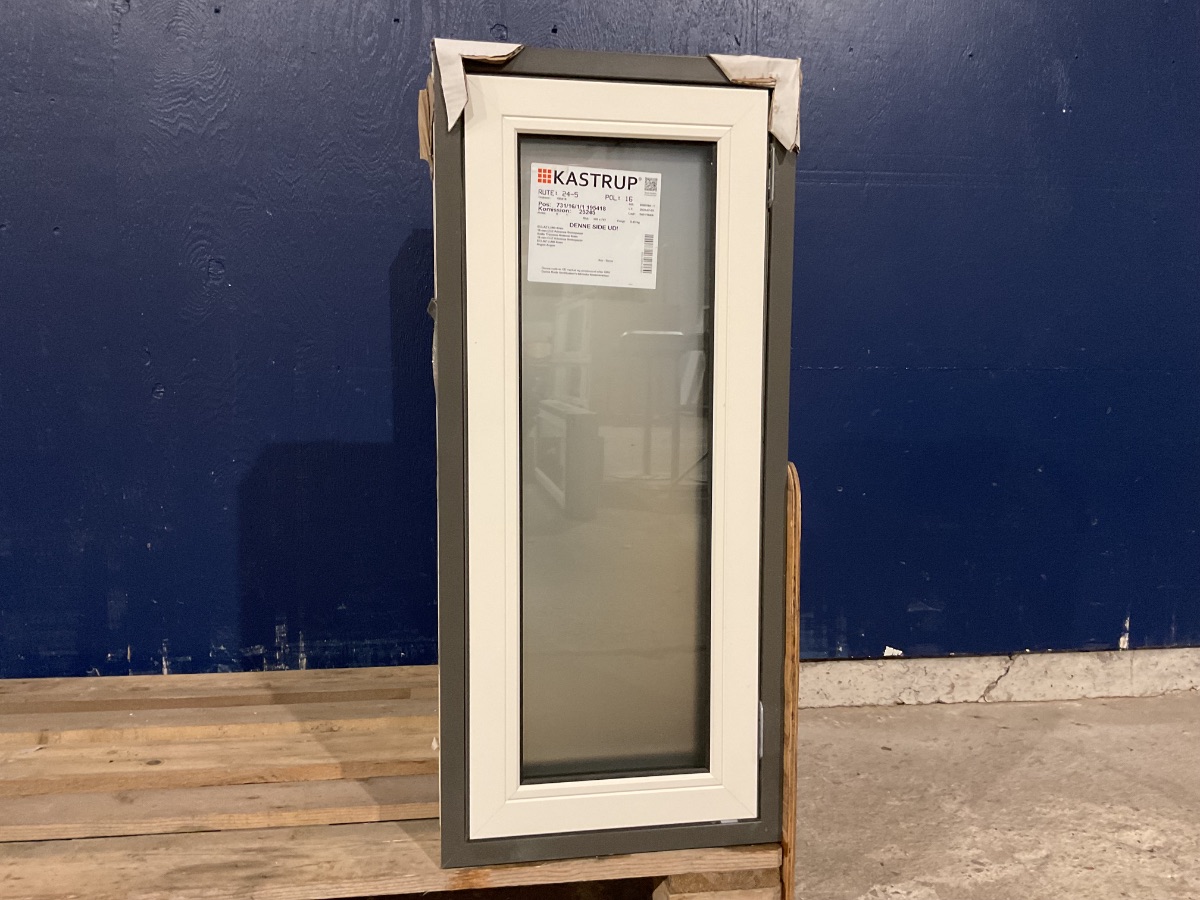 Ubrugt Kastrup Vindue, Alu/træ, 3 lag glas, sidehængt, udluftning, matteret, mål: H89,9 B39,7 D12,2 Varenummer: 1775 1, 3 lags glas, Sidehængt, Termovindue, Udluftning, Træ/Alu, Kastrup
