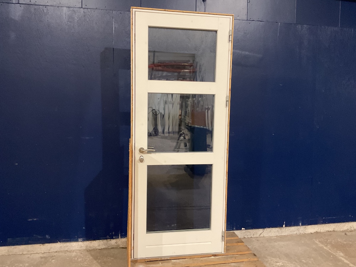 Brugt Rationel Yderdør, Alu/træ, 2 lag glas, højrehængt, indadgående, hårdttræsbundstykke, nøgle medfølger ikke, mål: Varenummer: 1788 Højrehængt, Indadgående, Enkelt, 2 lags glas, Hårdt træ, Træ/Alu, Rationel