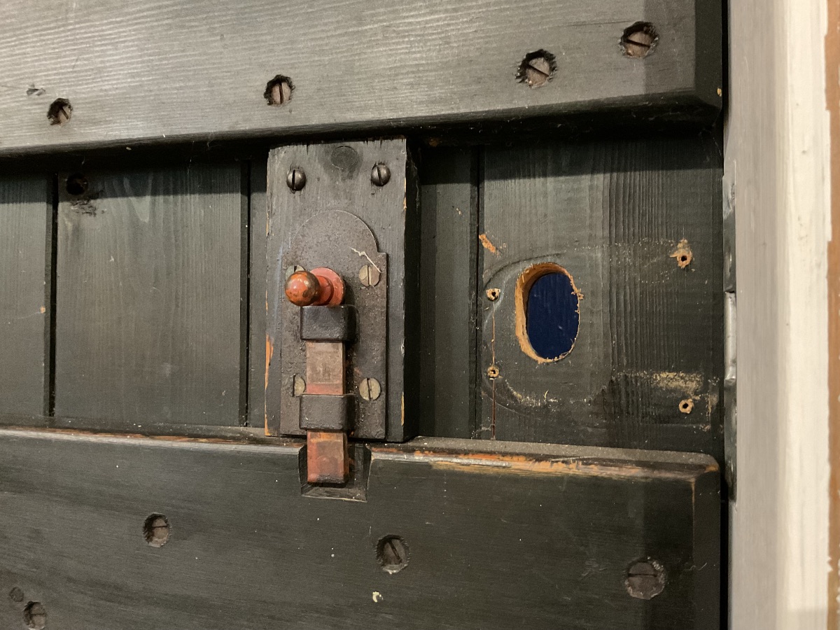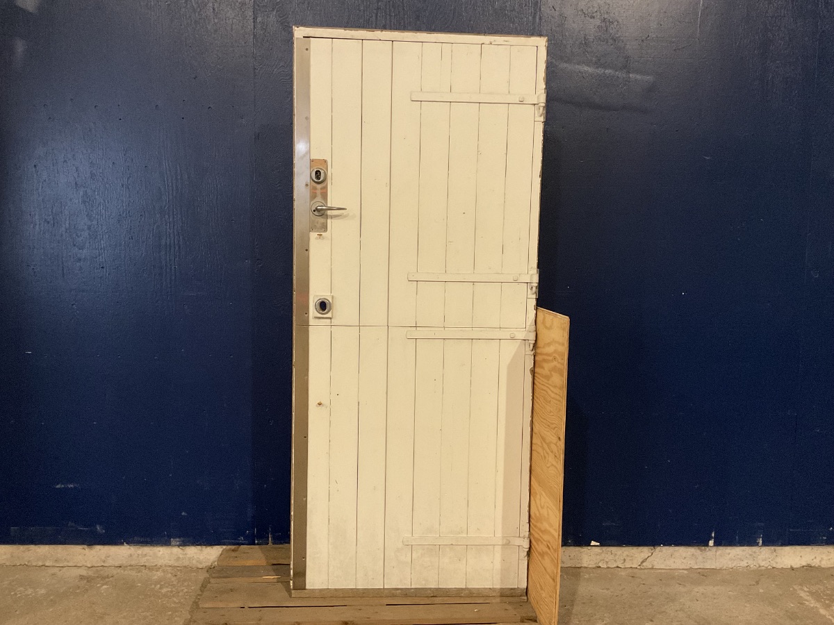 Brugt Stalddør, træ/træ, højrehængt, udadgående, hårdttræsbundstykke, mangler lås, nøgle lås og nøgle, mål: H202 B87 D12,1 Varenummer: 1812 Højrehængt, Udadgående, Enkelt, Plader, Hårdt træ, Træ/Alu, Andet