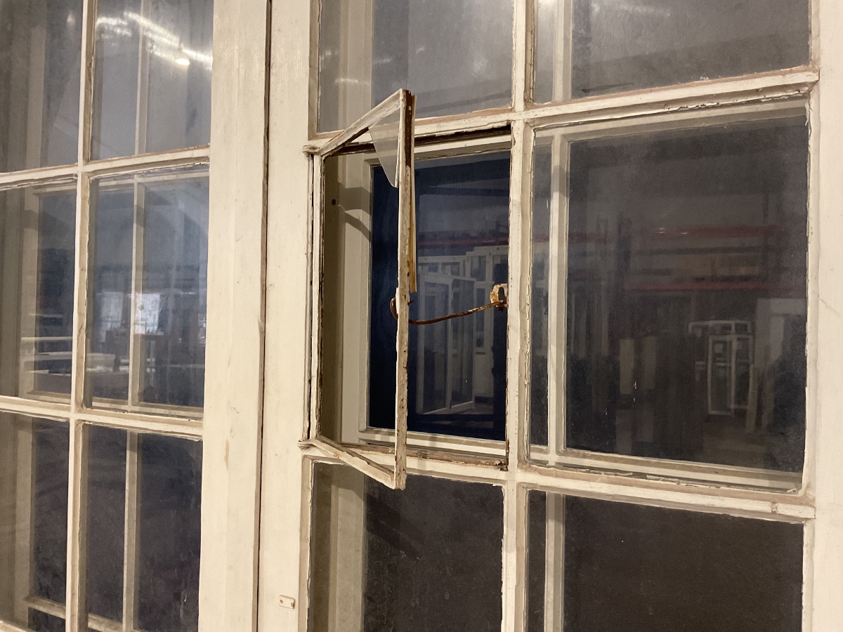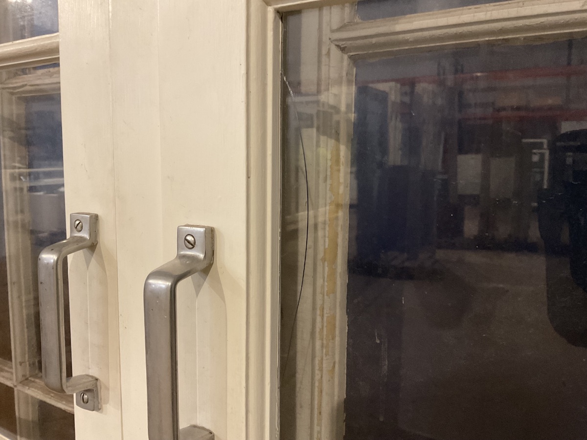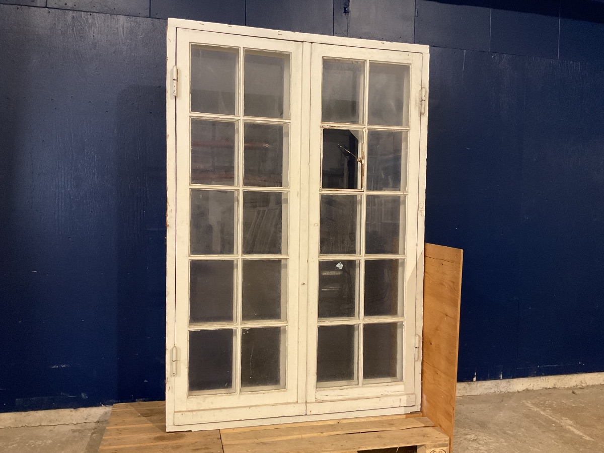 Brugt Ældre Terrassedør m. Forsatsruder, træ/træ, hængt på begge sider, indadgående og udadgående, hårdttræsbundstykke, 1 lag glas i hver dør, har en ødelagt rude på ydersiden og en med en flænge på indersiden, mål: H217,7 B149,2 D11,8 Varenummer: 1813 Højrehængt, Venstrehængt, Indadgående, Udadgående, Dobbelt, 1 lags glas, Hårdt træ, Træ/Træ, Andet