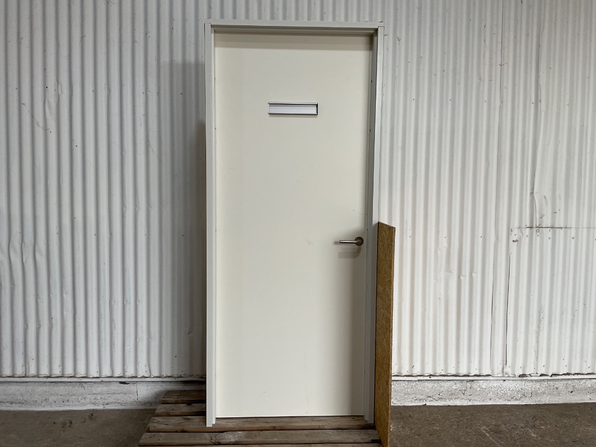 Brugt Indvendig Dør, døren er træ/træ men karmen er Alu/alu, højrehængt, indadgående, ingen bundstykke, mål: H208 B89 D12,3 Varenummer: 1873 Højrehængt, Indadgående, Enkelt, Plader, Ingen, Træ/Træ, Andet