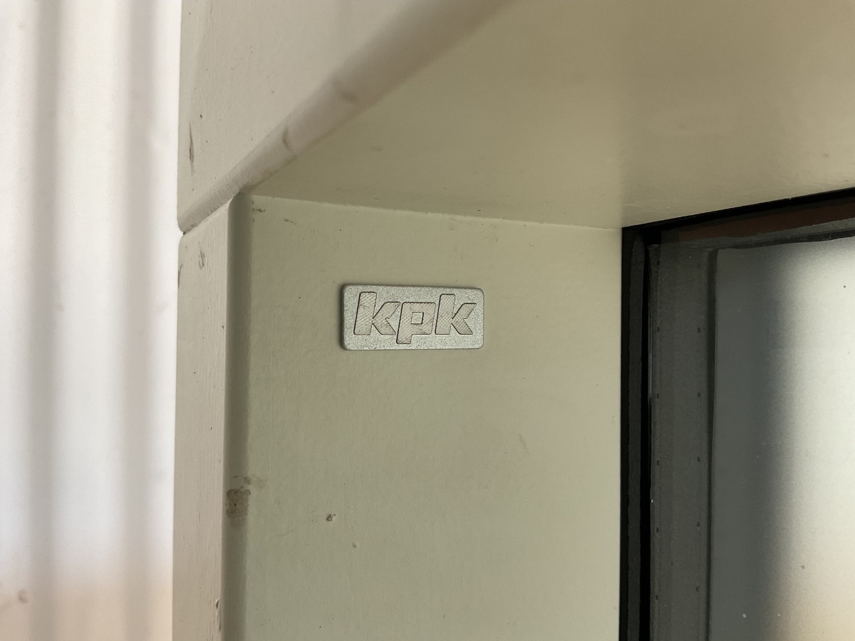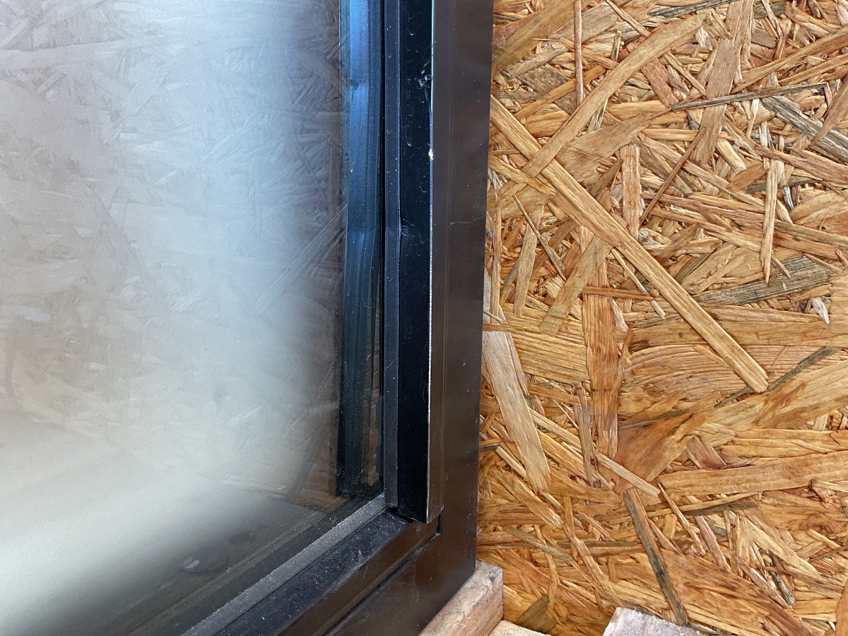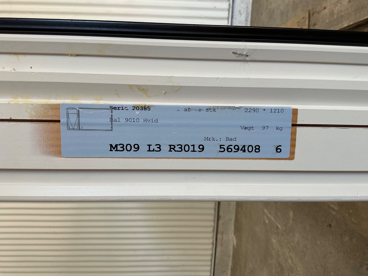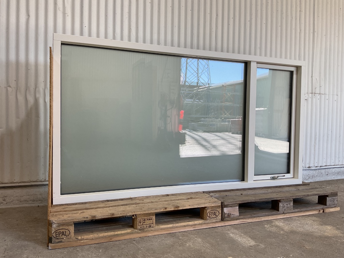 Test monteret Kpk Vinduesparti (Ingen fugemasse brugt, kun skruehuller), Alu/træ, 3 lag glas, topstyret/fastkarm, matteret, vinduet har en liste som er poppet lidt ud, mål: H229 B121 D12,4 Varenummer: 1896 2, 3 lags glas, Topstyret, Fastkarm, Termovindue, Træ/Alu, KPK