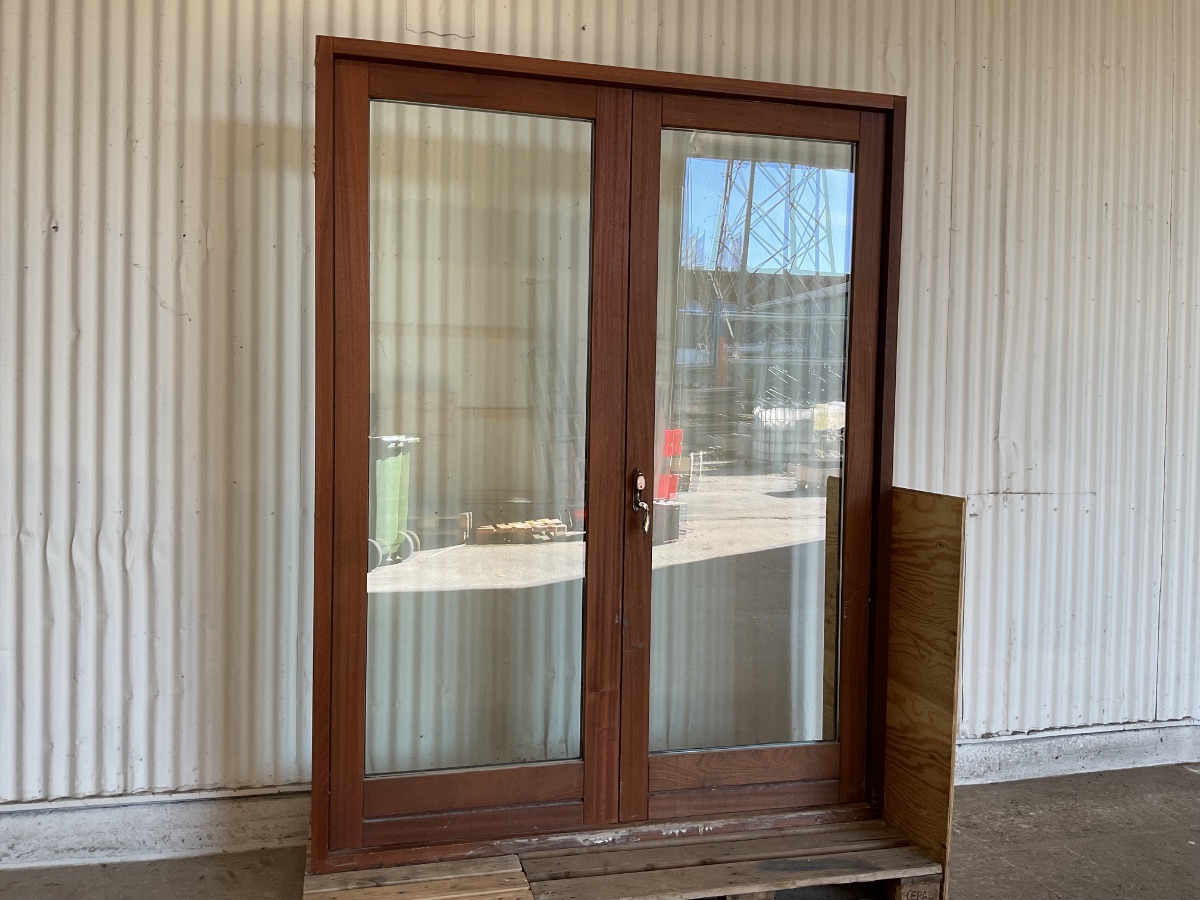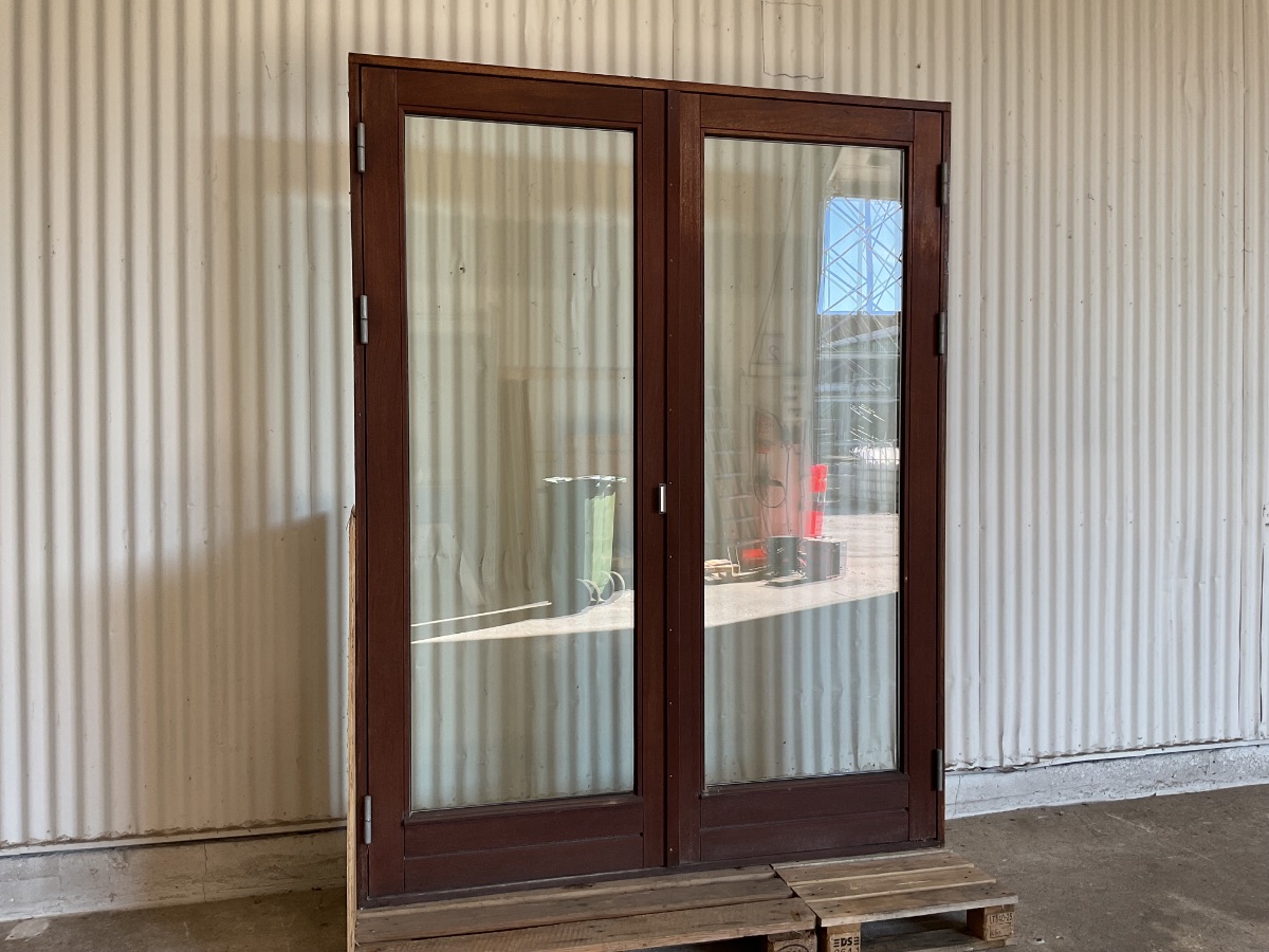 Brugt Mahogni Dobbelt Terrassedør, træ/træ, 2 lag glas, højrehængt og venstrehængt, udadgående, hårdttræsbundstykke, mål: H230,8 B178,3 D9,5 Varenummer: 1902 Højrehængt, Venstrehængt, Udadgående, Dobbelt, 2 lags glas, Hårdt træ, Træ/Træ, Andet