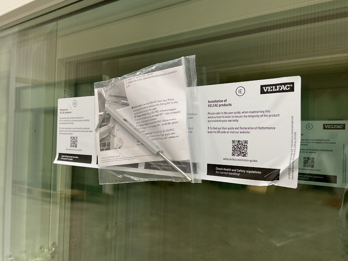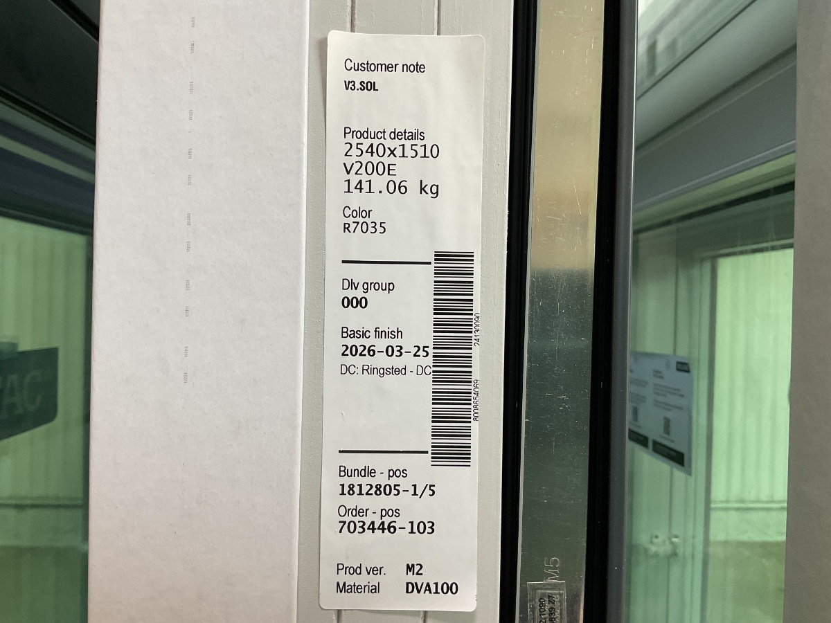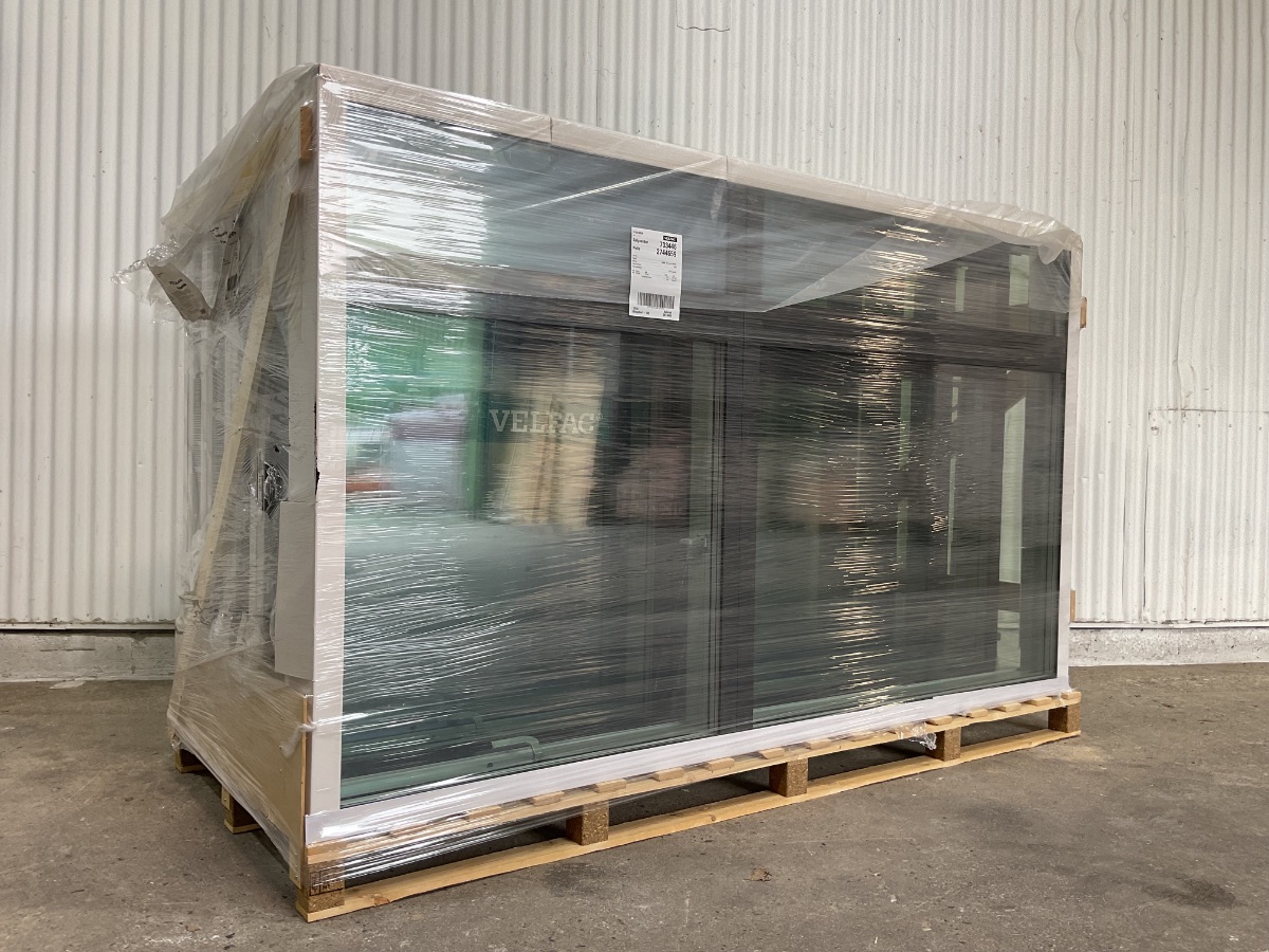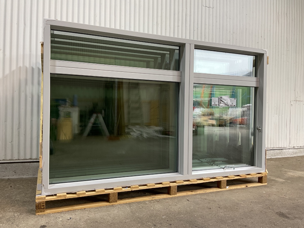 Ubrugt Velfac Vinduesparti, Alu/træ, 3 lag glas, topstyret/fastkarm, børnelås, monteret aritech sikkerhedssystem, udvendigt ral 7016 gl. 30 antracitgrå - indvendigt ral 7035 lysgrå, mål: H151 B254 D15 Varenummer: 1911 2, 3 lags glas, Topstyret, Fastkarm, Termovindue, Træ/Alu, Velfac