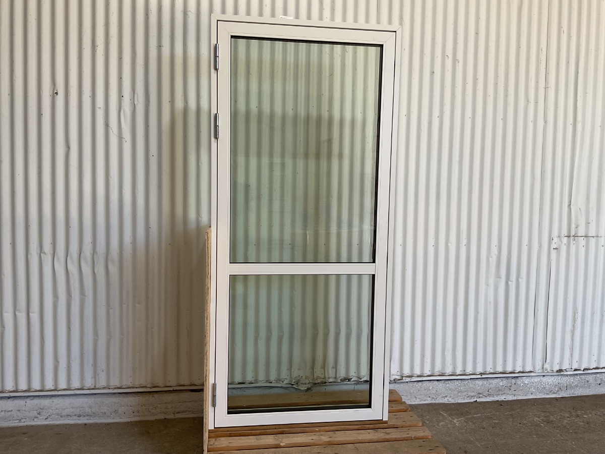 Ubrugt Vindunor Terrassedør, Alu/træ, 3 lag glas, venstrehængt, udadgående, hårdttræsbundstykke, mål: H218,2 B99,7 D12,8 Varenummer: 1964 Venstrehængt, Udadgående, Enkelt, 3 lags glas, Hårdt træ, Termo, Træ/Alu, Andet