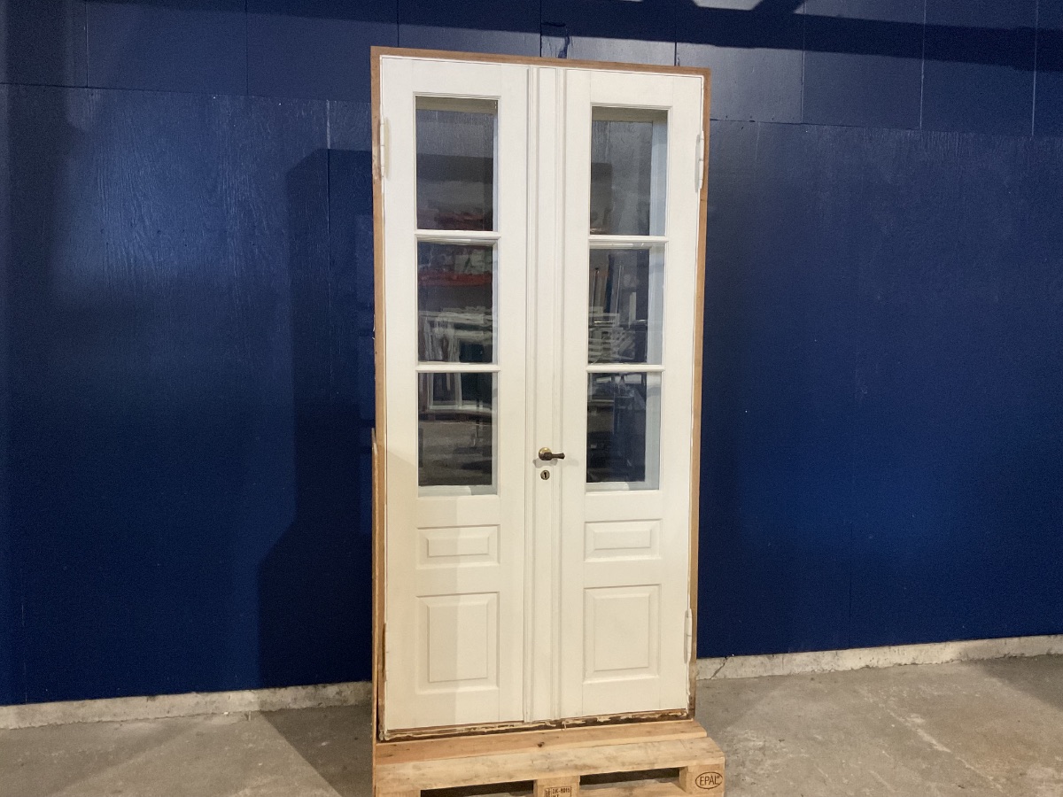 ntik forsatsdør fra præstegård (H: 242,2 x B: 119,3 x D: 22,8 cm) Over 100 år gammel forsatsdør i massivt træ med originale rammer og 1-lags glas. Døren stammer fra en gammel præstegård og er et autentisk antikt stykke håndværk med patina og klassiske detaljer, der vidner om historien. En dobbeltdør i træ/træ, perfekt til bevaring eller restaurering af ældre bygninger – eller som en unik arkitektonisk detalje i nye rammer. Stand 3/5 med tydelige brugsspor, som ses på billederne. Varenummer: 404 Højrehængt, Venstrehængt, Indadgående, Udadgående, Dobbelt, 1 lags glas, Hårdt træ, Træ/Træ