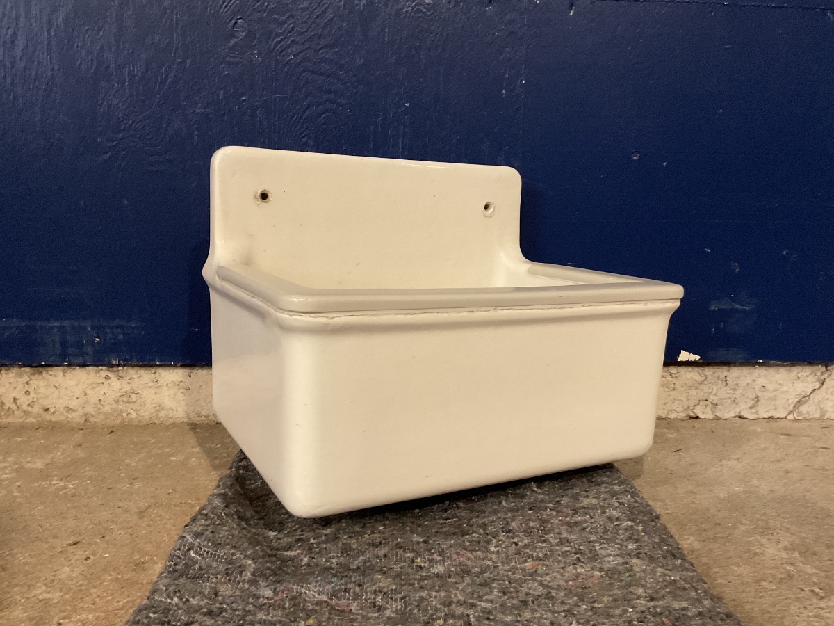 Klassisk udsalgsvask i porcelæn (H: 37,6 x B: 50,7 x D: 38 cm) Solid og tidløs udsalgsvask i hvid porcelæn, perfekt til bryggers, værksted eller vaskerum. Den dybe kumme gør den ideel til rengøring og praktiske gøremål, hvor en robust vask er nødvendig. Vasken har to små hakker i kanten (se billeder), men er stadig fuldt funktionel og klar til montering. Varenummer: 649