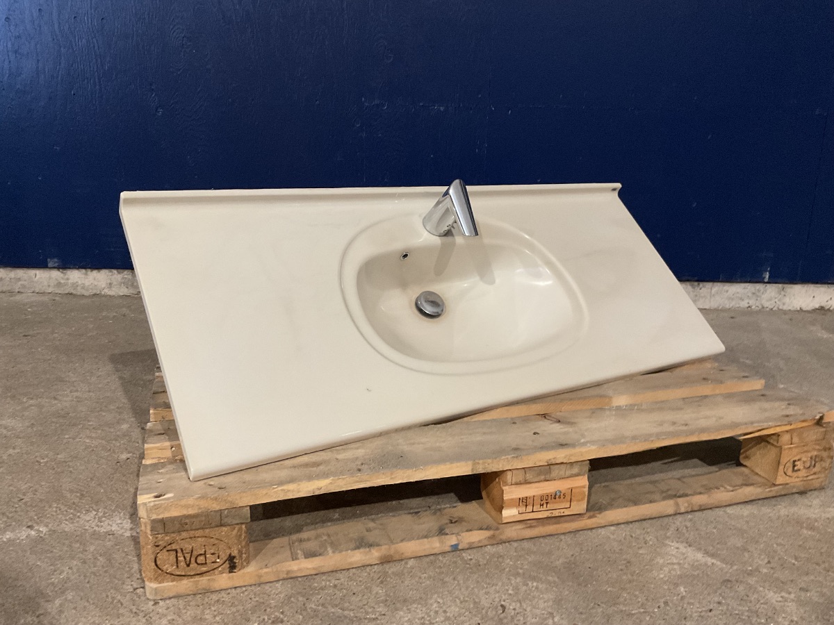 Kuma badeværelsesvask med touchless armatur (H: 2,3 x B: 120 x D: 49,8 cm) Funktionel badeværelsesvask fra Kuma med moderne touchless armatur, der sikrer en hygiejnisk og brugervenlig løsning til badeværelset. Den brede plade giver ekstra afsætningsplads og et stilrent udtryk. Vasken har et lille hak i pladen (se billeder), men fremstår ellers som en praktisk og solid løsning, der kombinerer funktionalitet og enkelt design. Varenummer: 651