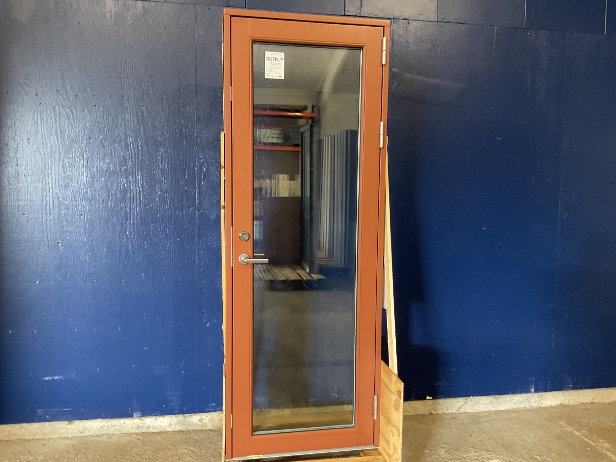 Ubrugt Outrup Yderdør, Døren har press glass og er fra 1/5/2025, nøglelås medfølger ikke Varenummer: 688 Højrehængt, Udadgående, Enkelt, 3 lags glas, Alu, Termo, Træ/Træ, Outrup