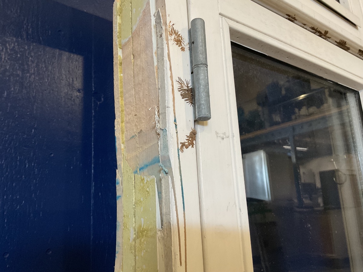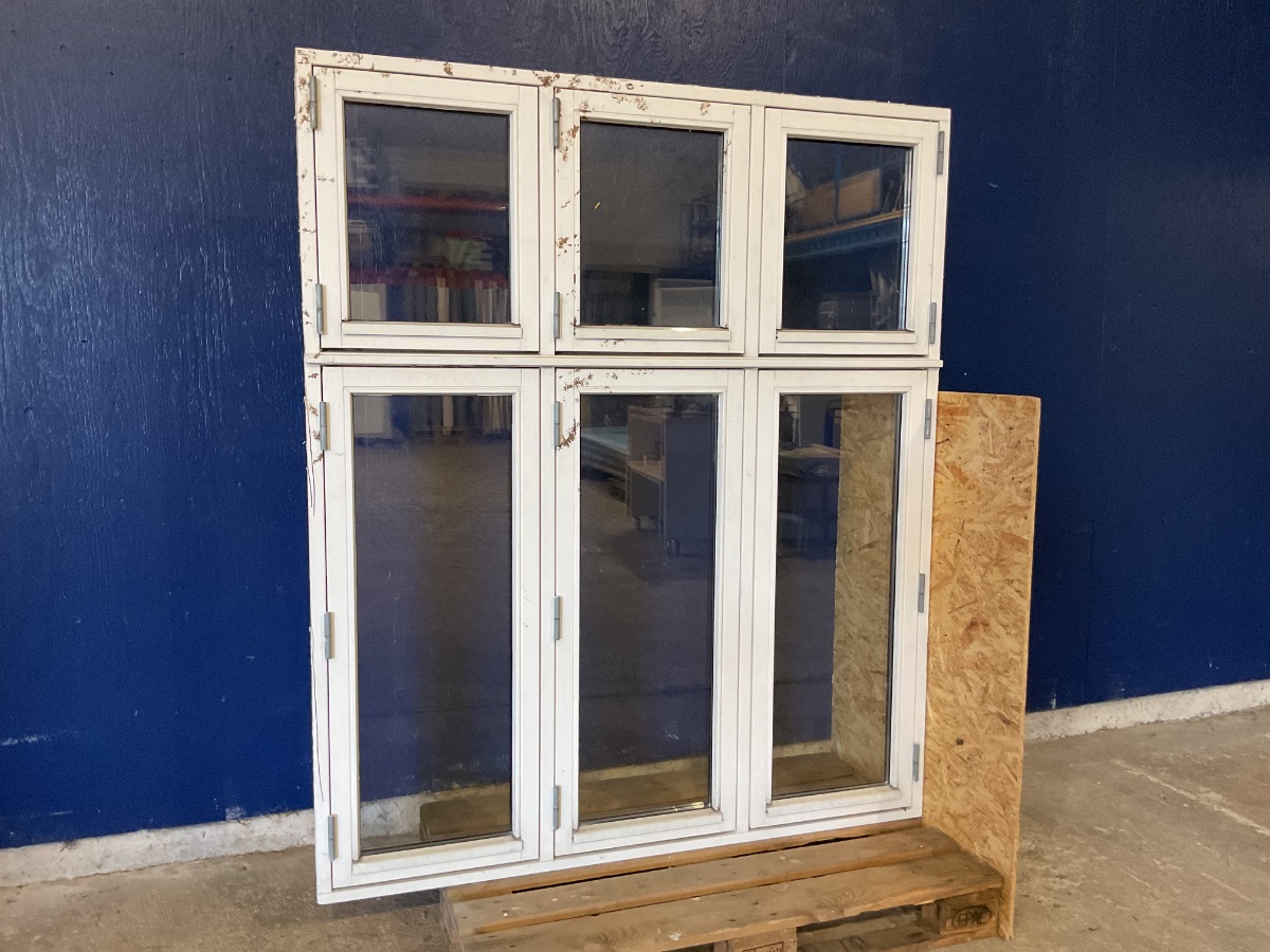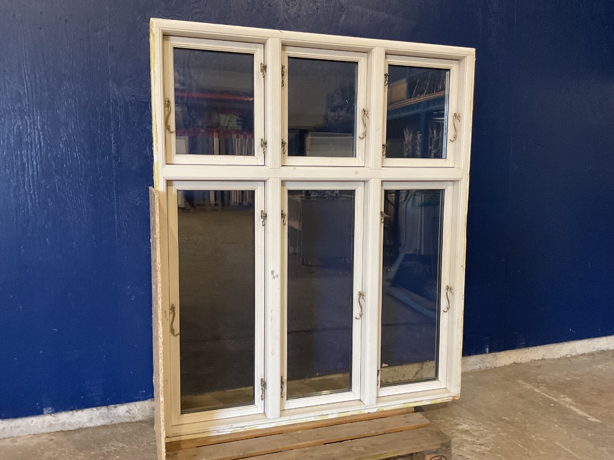 Brugt Dannebrogsvindue, har lidt skader på yder og indersiden, kan ses på billeder Varenummer: 691 2 lags glas, Sidehængt, Træ/Træ, 5+