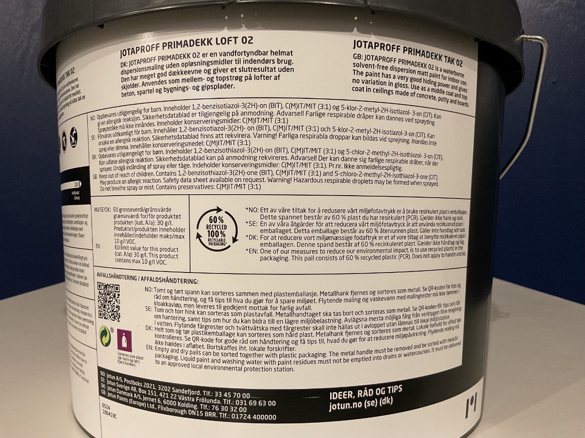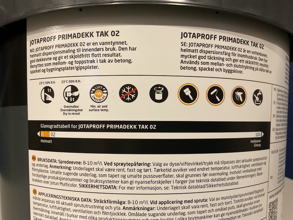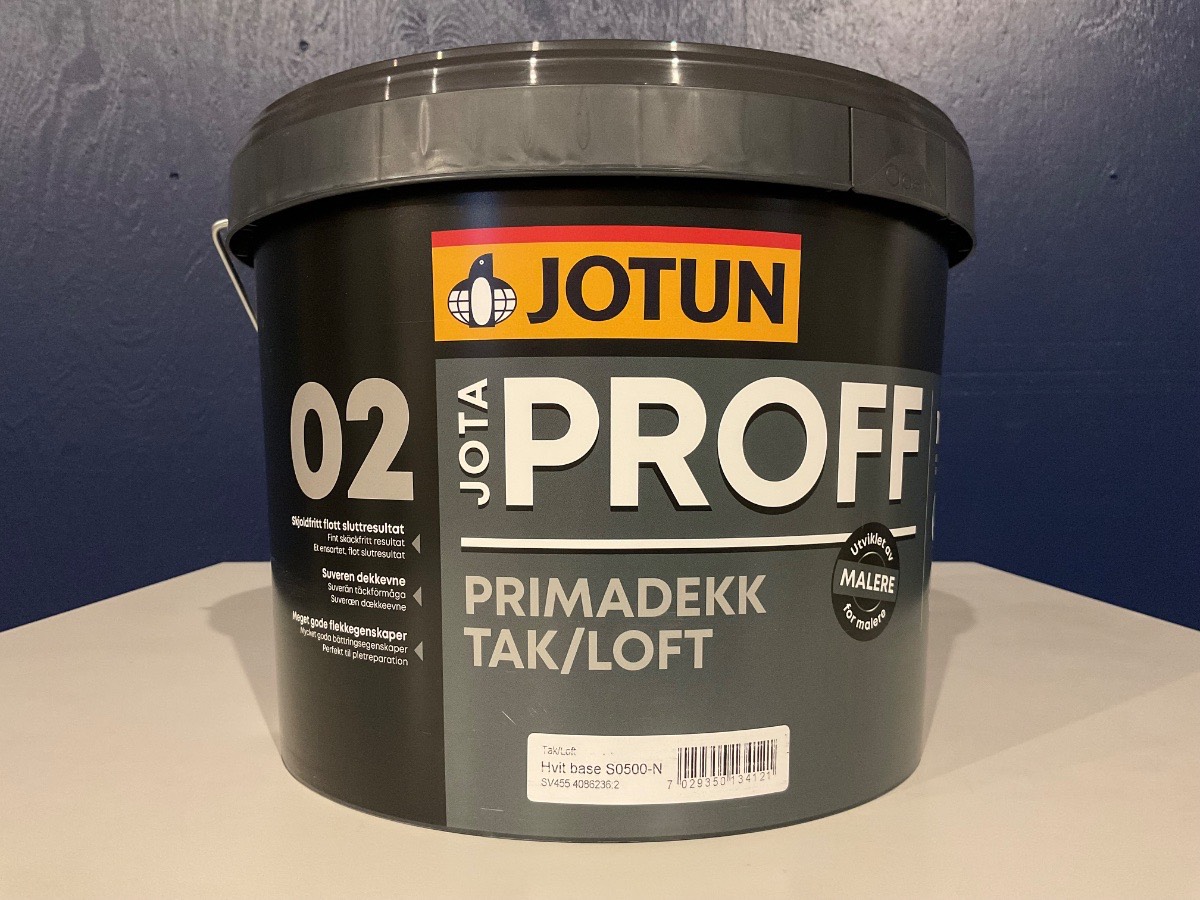 Ny Jotaproff Primadekk Hvid Tak 02| 9 L, info om produktet kan ses på billederne, tjek vores hjemmeside for lager status! JOTAPROFF Primadekk er en suveræn loftmaling, specielt tilpasset de professionelle malere. Vores allerbedste loftmaling til profferne Et ensartet, flot slutresultat Suveræn dækkeevne Perfekt til pletreparation Varenummer: 728 Hvid